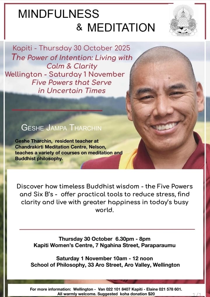 For more information – Elaine 021 578 601, or email – meditate@chandrakirti.co.nz